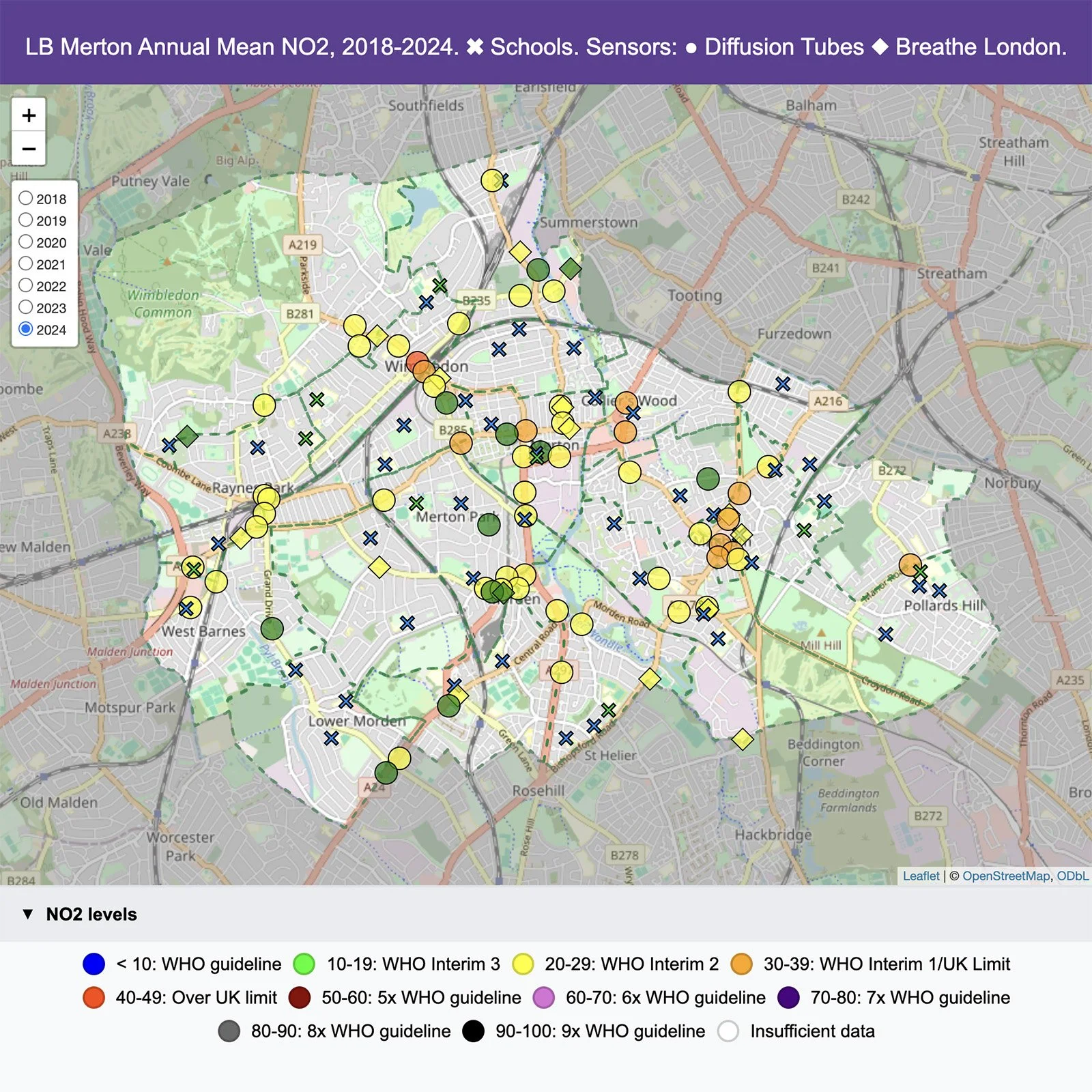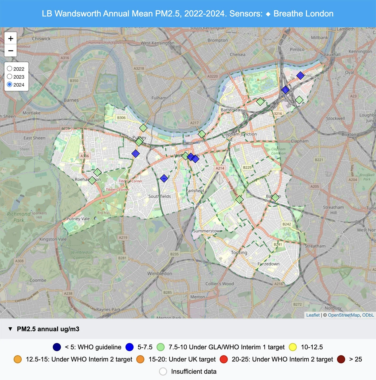 By 2024, most areas of Wandsworth achieved NO₂ levels within the Councils target of 30µg/m³, a huge improvement over historic levels in places like Putney High St. Higher levels in areas like West Hill continue to prompt further action as we work towards the WHO guideline values. You can explore our full measurements in the linked maps.