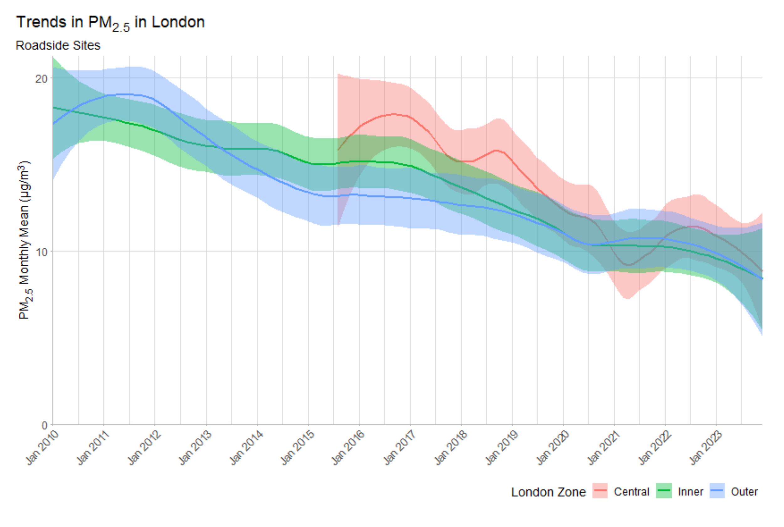 The graph below shows how much annual average PM2.5 air pollution has changed in the last 15 years in London. In the early 2000s, annual levels were around 2 times higher than today, with many areas now within the UK limits and moving towards the WHO guideline. From Figure 8 of Air Quality in London 2016-2024, Greater London Authority, 2024.