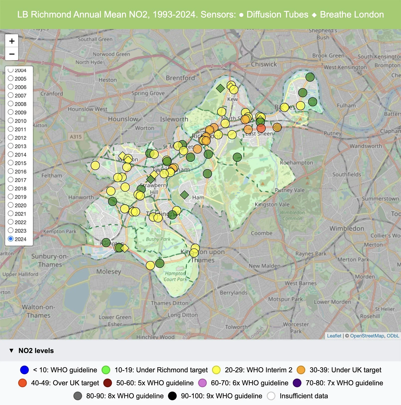 Air pollution in Richmond is at its lowest levels since measurements began in 1993. In 2024, many areas away from roads attained the Council’s 20µg/m³ target, with most other areas approaching it. Levels at Upper Richmond Road West and George St remain of most concern. We continue to work towards the WHO guideline values. You can explore our full measurements in the linked maps.